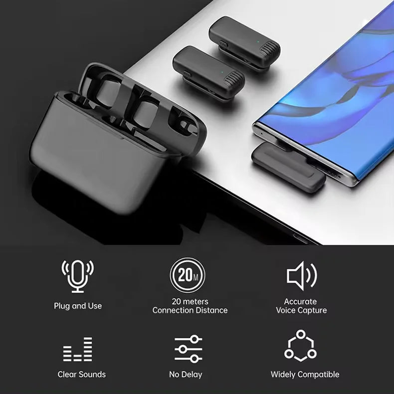 - El micrófono de grabación inalámbrico está diseñado con una potencia súper penetrante y una frecuencia de transmisión de 2,4 GHz. La distancia de transmisión más larga es de hasta 20 metros. Con 0.008 s de retraso en la transmisión, te ayuda a grabar o tomar videos claramente a una distancia amplia. Bien diseñado para entrevistas, YouTube, Facebook Live Stream, etc.