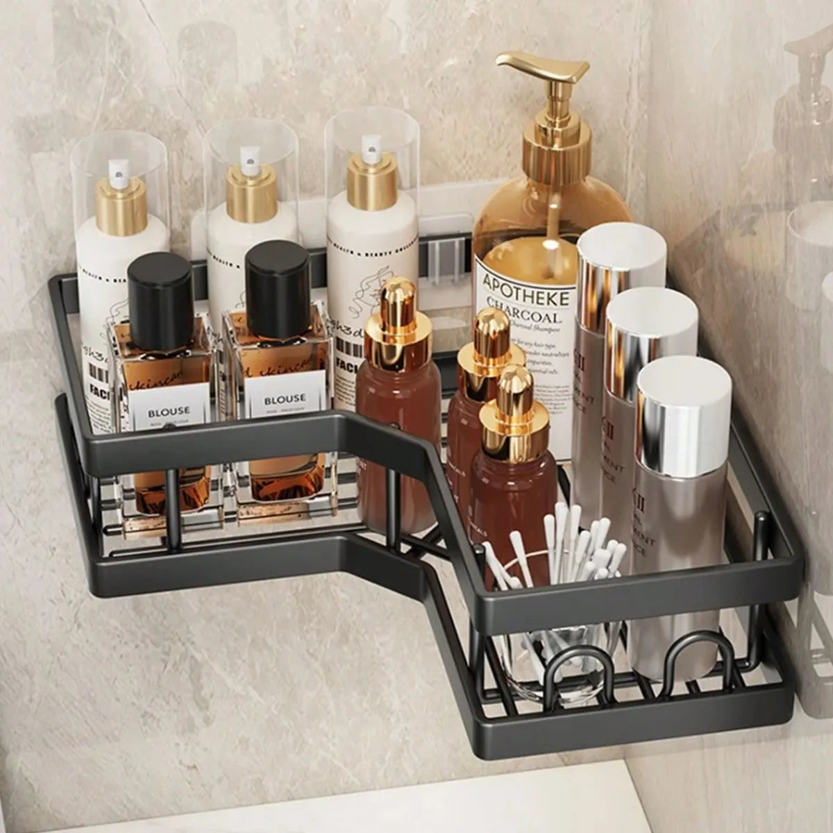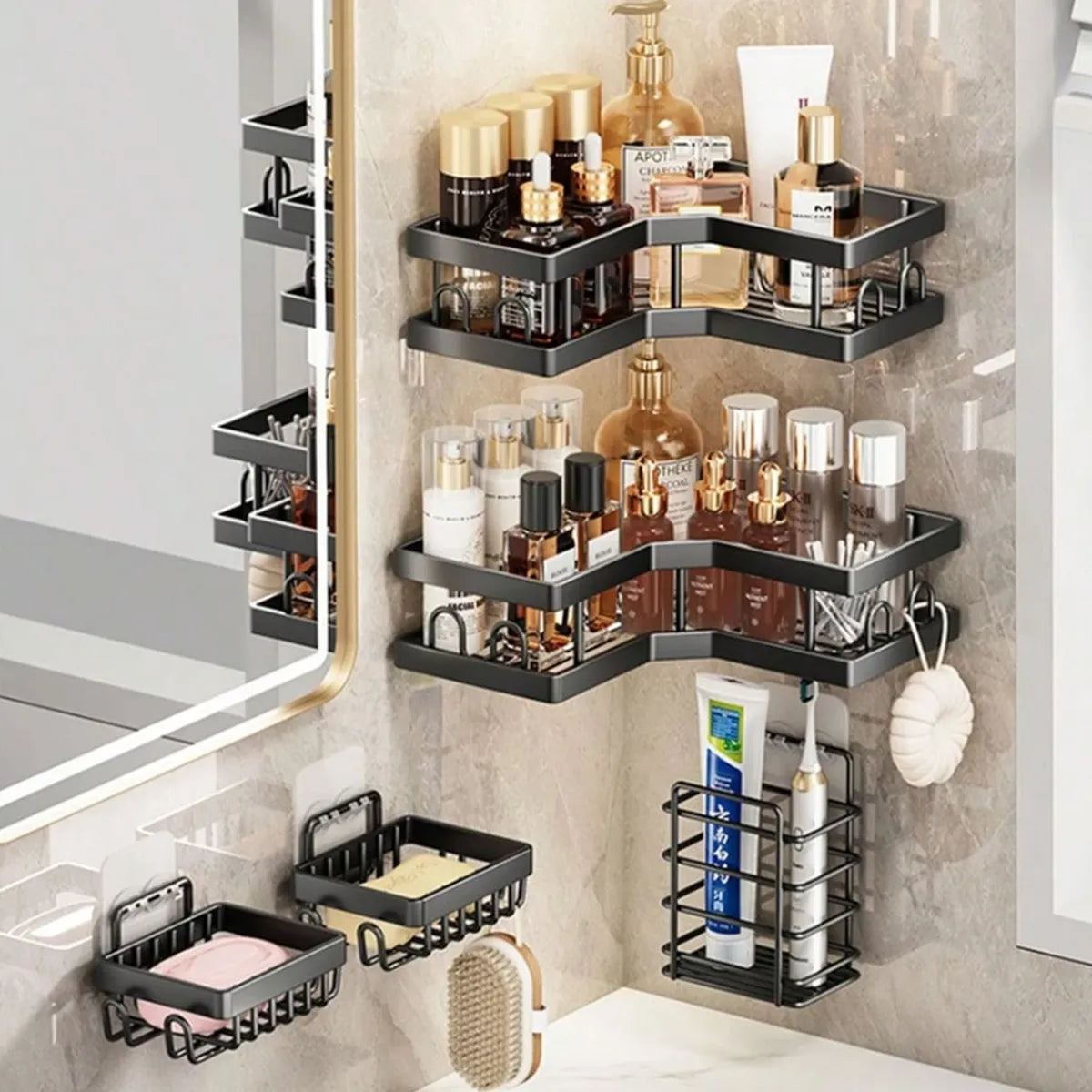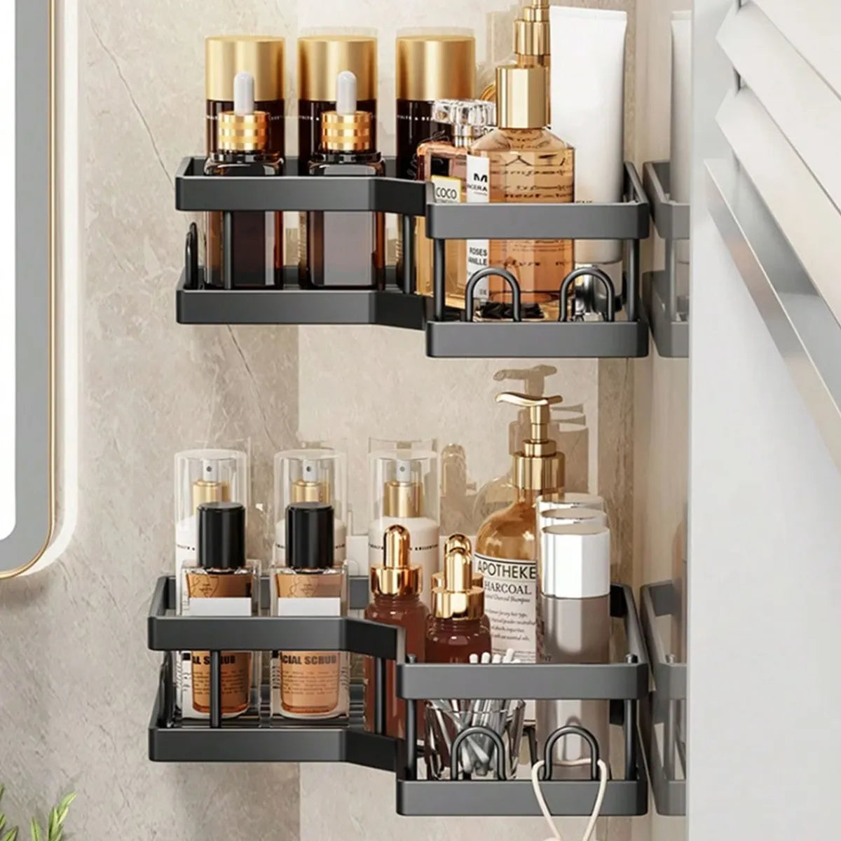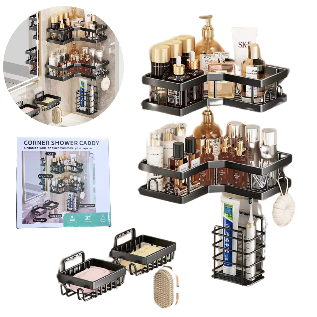 Nota: Este set de ducha se adapta a esquinas de pared de 90 grados, no es adecuado para espacios de esquinas redondeadas o curvas. - Estructura sólida más gruesa y resistente a la corrosión: la estructura de la cesta de ducha de esquina está hecha de acero inoxidable, recubierta con pintura inoxidable y alambre más grueso que los caddies de ducha del mercado. Este carrito de ducha adhesivo permanece libre de óxido y mantiene un alto brillo durante años. - 12 ganchos humanizados y soporte para jabón: el diseño humanizado de 12 ganchos del carrito de ducha adhesivo y soporte para jabón separado resolvió los problemas de almacenamiento. Deja más espacio para esponjas de baño, maquinillas de afeitar, cepillos de baño y otros accesorios de lavado en este carrito de ducha de esquina. - Fácil de instalar y quitar: este carrito de ducha de esquina marrón es fácil de instalar con el adhesivo en lugar de con la ventosa.